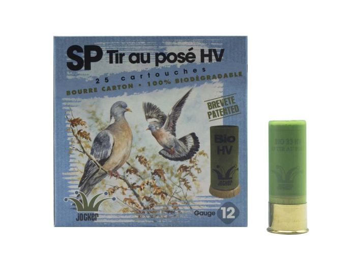 Boîte de 25 cartouches Jocker BIO SP Tir au posé 33 HV C/12/70/16 - Bourre biodégradable La cartouche Jocker BIO SP Tir au posé 33 HV est une cartouche dont la bourre est biodégradable. Elle est chargée de 33g de plomb. Cette cartouche est destinée au tir du pigeon ramier au posé. Sa distance idéale d'utilisation est de 20 à 35m. Elle offre une gerbe plus serrée qu'une cartouche standard à bourre plastique car l'intégralité de sa gerbe est englobée dans sa bourre carton. Elle conviendra parfaitement pour le tir des oiseaux posés. Sa gerbe très dense permettra de tuer net l'oiseau tiré. Sa bourre carton 100% biodégradable (1) brevetée disparaitra totalement du milieu en quelques semaines. Bourre adaptée à tous les diamètres de canons permettant de restituer 100% de la poussée de la poudre, contrairement aux bourres plastiques Disponibles en trois configurations 6/7,5/8,5 (1)(selon la norme AFNOR)